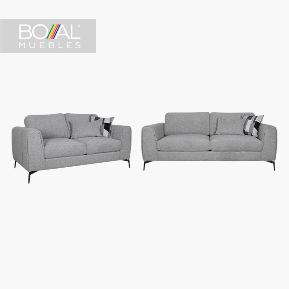 Sala compuesta por 1 Sofá y 1 Love Seat Temple fabricados por Muebles Boal en una de nuestras configuraciones más cómodas. Caracterizada por su inigualable forma con materiales de construcción elegidos, la Calidez, Comodidad y Calidad resaltan aún más. Estructura fabricada con madera de pino de 3/4 de pulgada, cepillada, seca y estufada. Ensamblado con grapas de 2 pulgadas. Asientos con espuma de 24kg/m^3 de densidad y firmeza de 28lb. Resorte zig-zag cal. 8. Tapizado en Gris y soporte inferior en Metal, el cual eleva la presencia del modelo Temple. *Incluye cojines presentados
