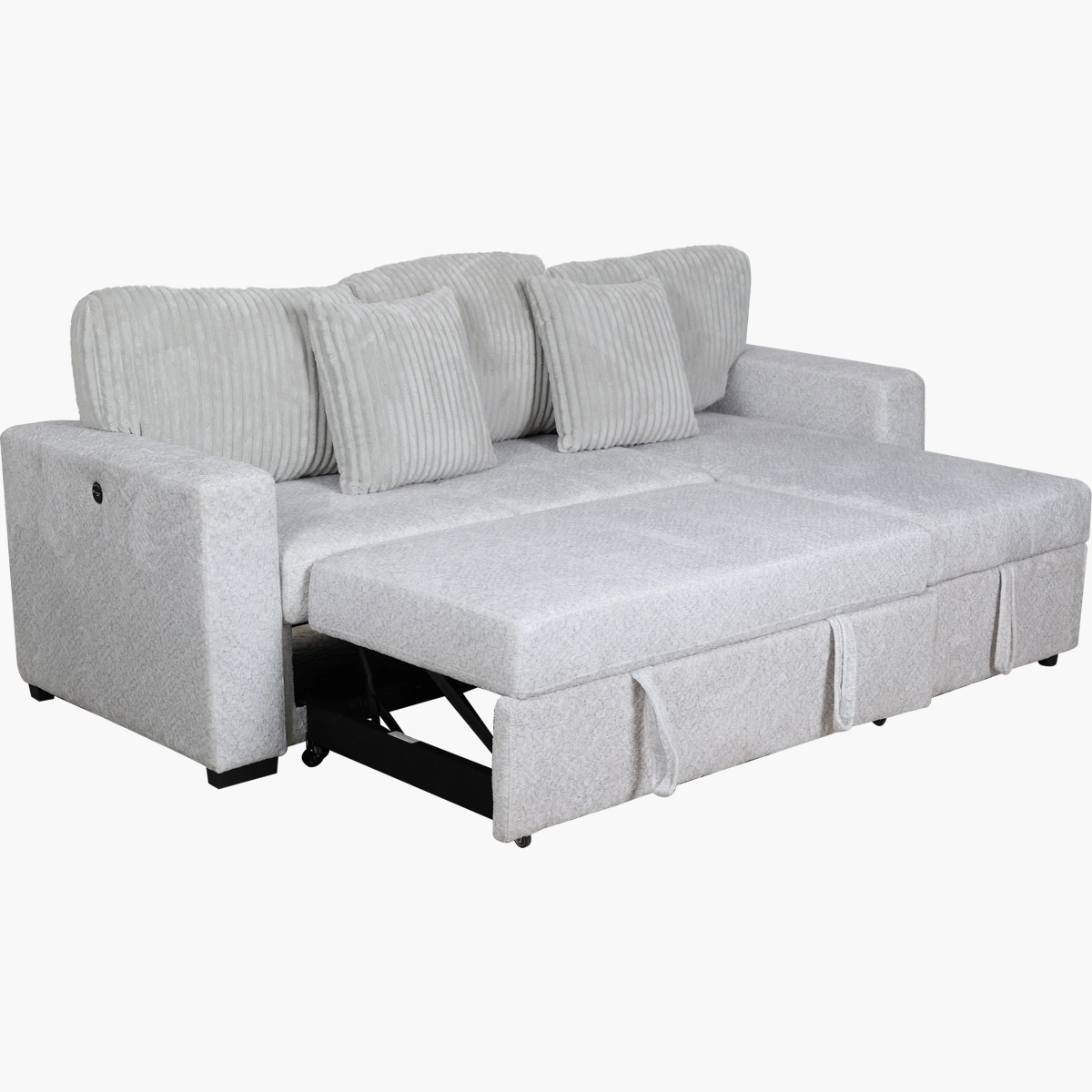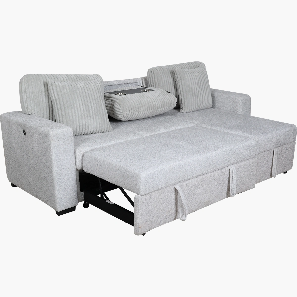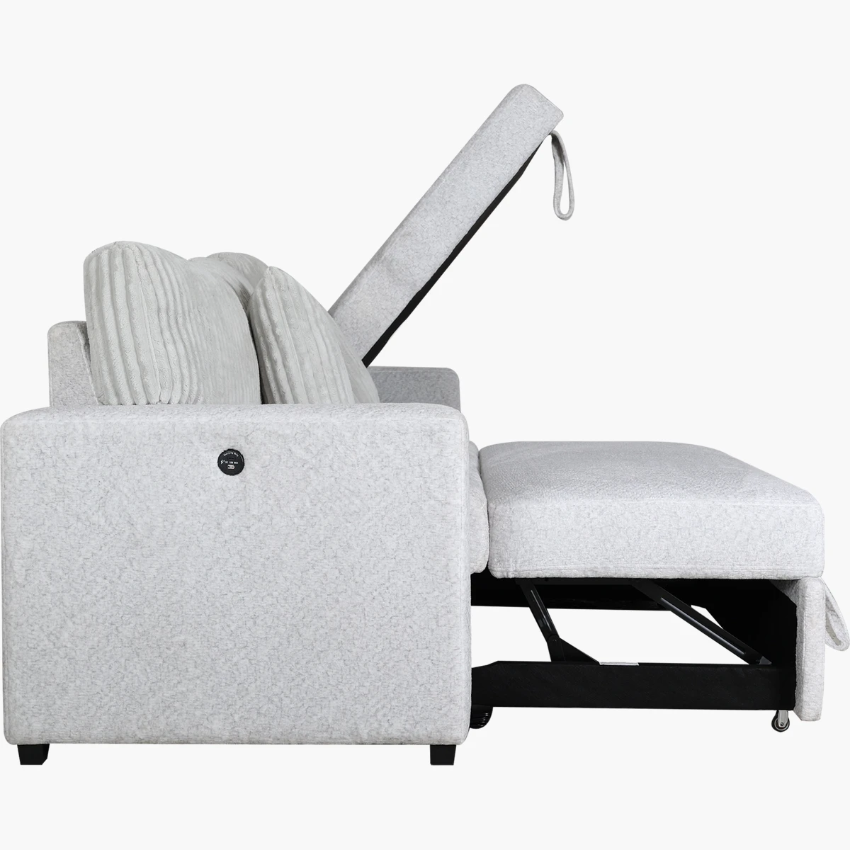 Cuenta con entradas USB y USB-C en ambos costados, lo que permite mantener tus dispositivos cargados mientras descansas. Tapizada en tela suave y duradera, incluye cojines decorativos a juego que aumentan el confort y el estilo.