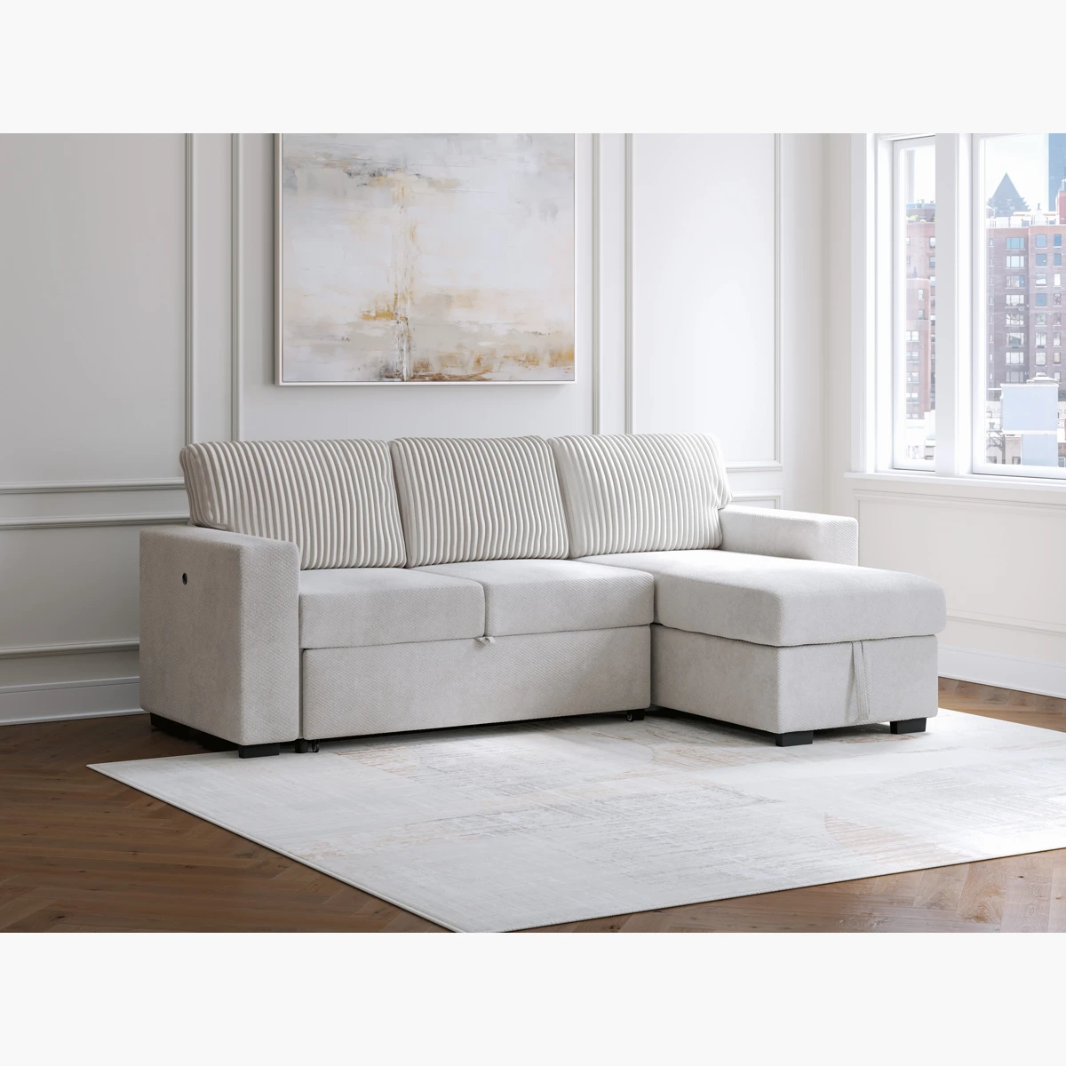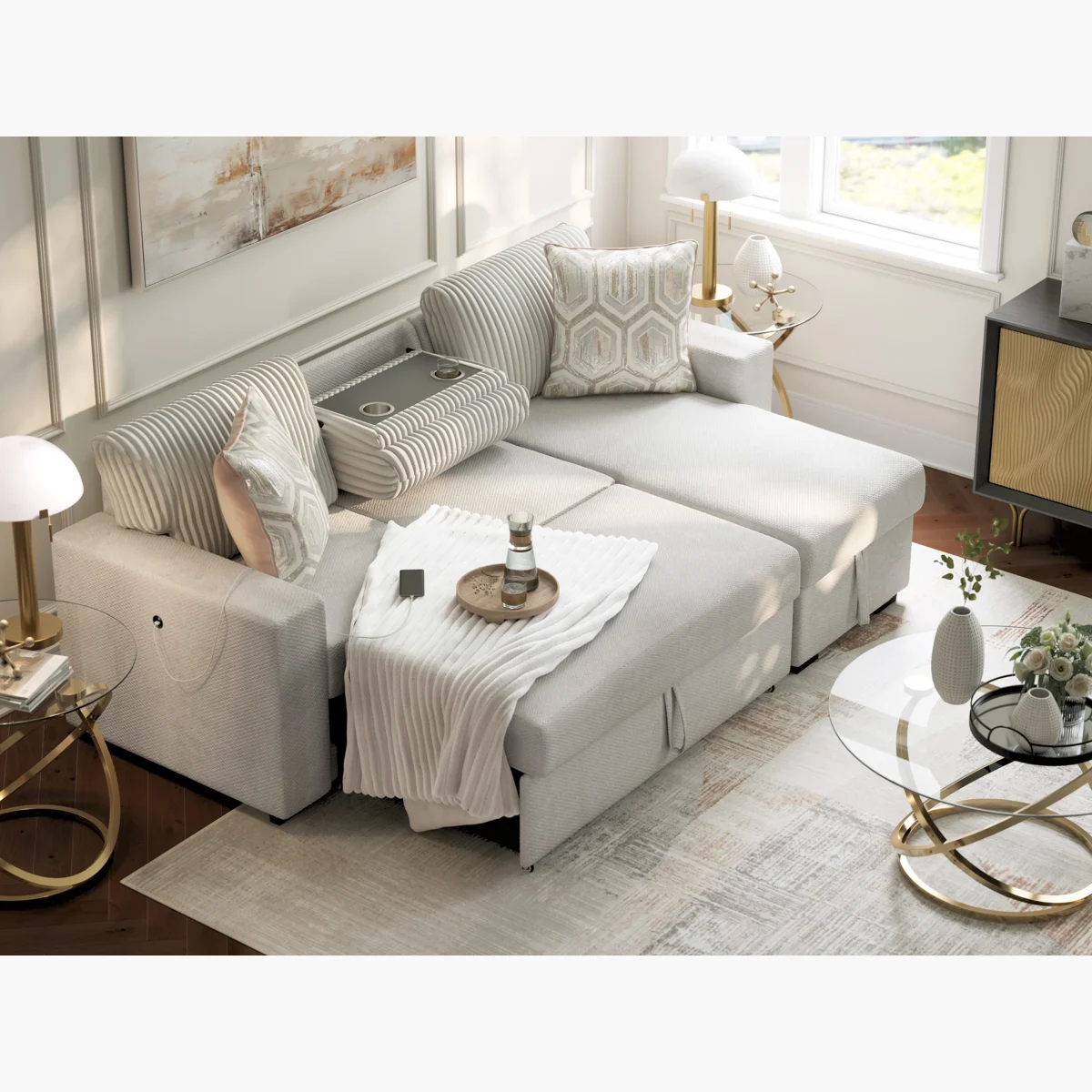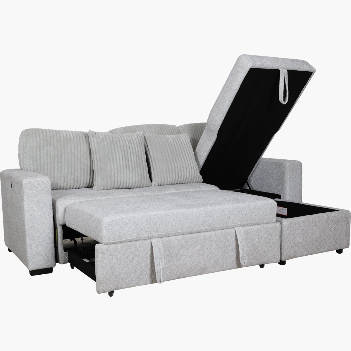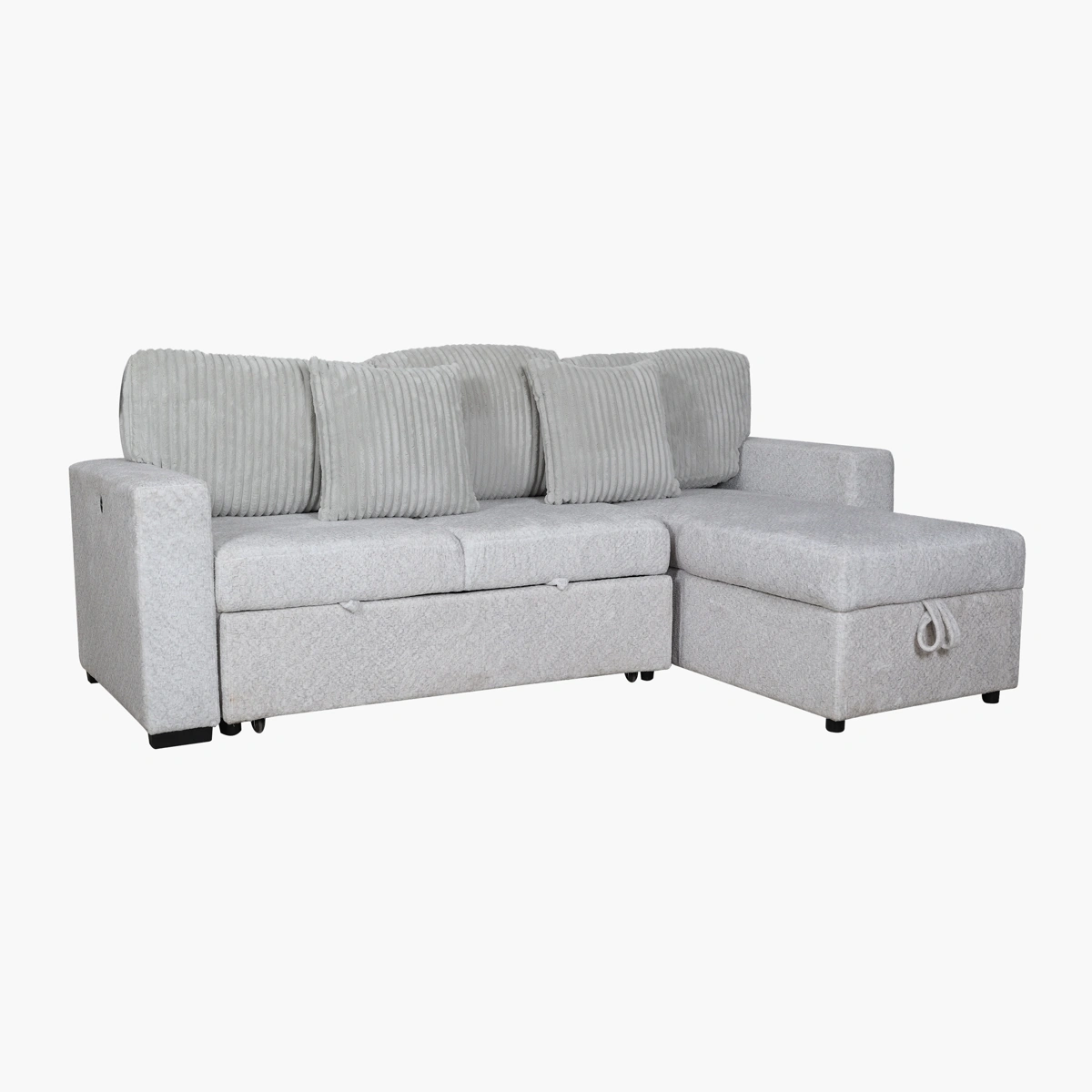 Cuenta con entradas USB y USB-C en ambos costados, lo que permite mantener tus dispositivos cargados mientras descansas. Tapizada en tela suave y duradera, incluye cojines decorativos a juego que aumentan el confort y el estilo.