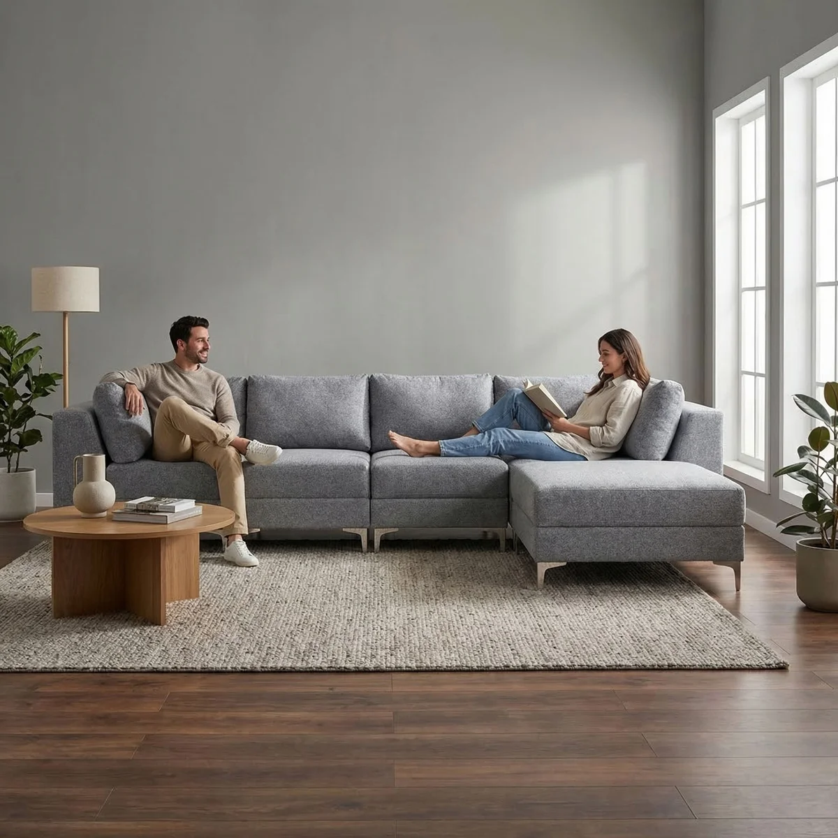 La calidad del material y la construcción de la sala esquinera Izel son destacadas. La madera de pino es resistente y duradera, mientras que la espuma de alta densidad proporciona un confort y soporte adecuados. Los soportes en cromo son resistentes al óxido y el tapiz Oslo es fácil de limpiar y mantener. Esto hace que el producto sea duradero y funcional en el día a día, resistiendo a las actividades y movimientos de la familia.