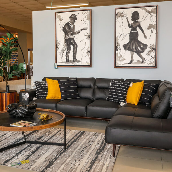 Materiales: Madera de pino, espuma 24kg/m³, resortes zig-zag cal. 8, tapizado en piel y vinil Corea negro, base de madera tono miel, patas metálicas.