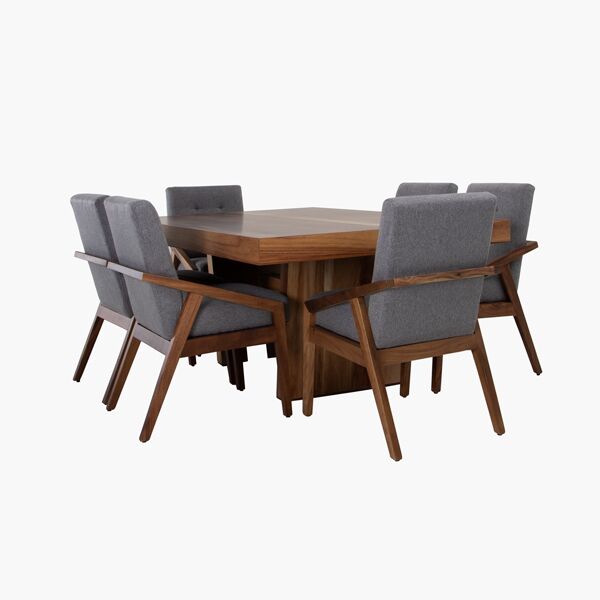 El Comedor Betta con sillas Ava Grey es una opción elegante para espacios como comedores, áreas de comedor o cocina-comedor. Su estilo moderno y sofisticado se debe a la combinación de la chapa de parota en la mesa y las sillas de parota sólida con tapiz Drill en tono Dark Grey. Esto lo convierte en un comedor elegante que puede ser el centro de atención en cualquier habitación.