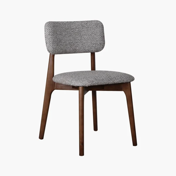 | Material | Mesa con cubierta en cerámica gris y base en madera acabado nogal. Sillas en fresno tono nogal, respaldo con parte posterior en chapa de nogal y tapiz en tela gris. |