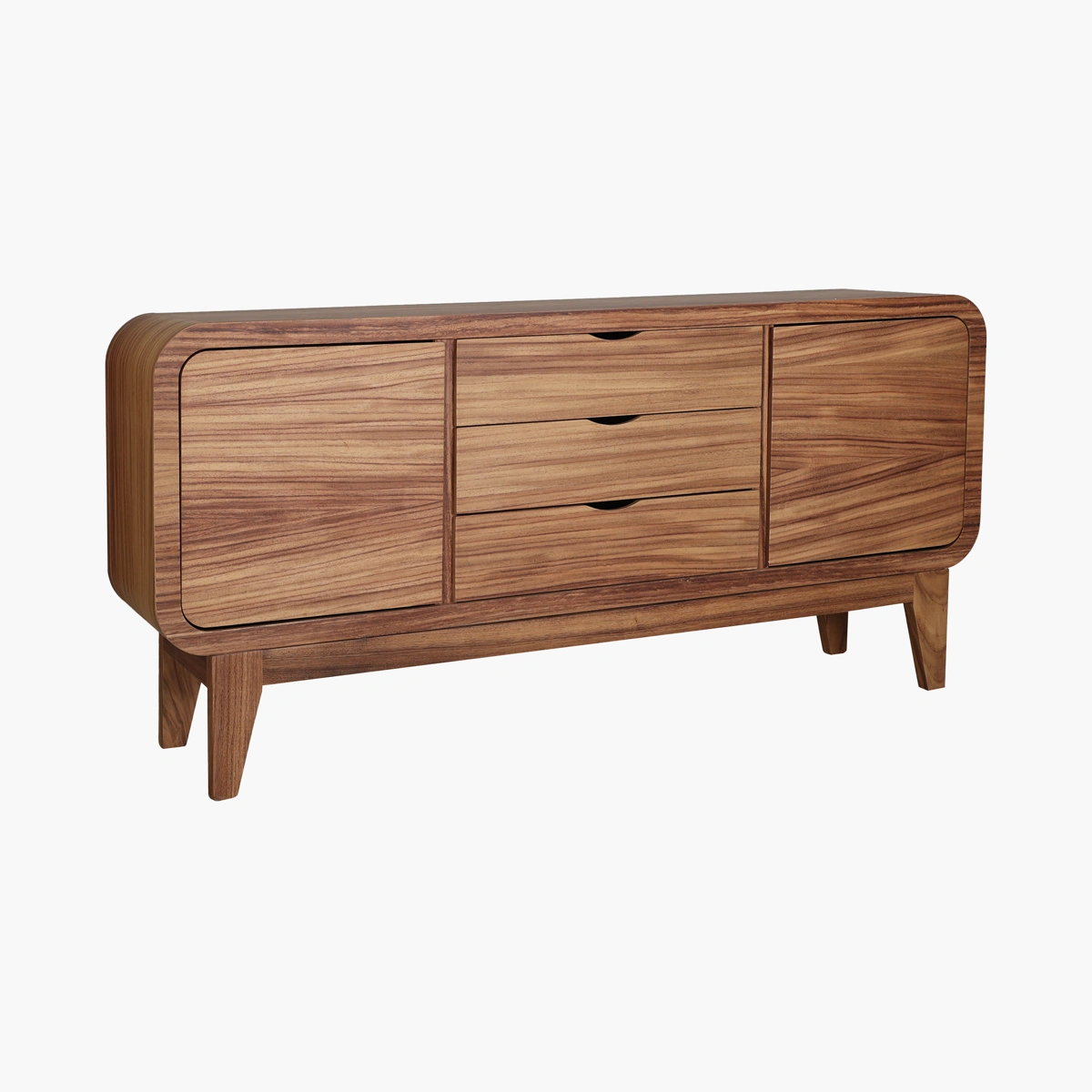 Con estructura en madera de parota sólida y detalles en chapa natural de parota, este bufete combina almacenamiento inteligente y diseño elegante. Cuenta con tres cajones centrales de gran capacidad y dos puertas laterales con repisas interiores, ideales para organizar vajillas, textiles o accesorios decorativos.