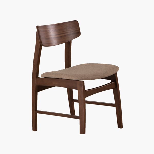 Elegante, minimalista y hermosa silla para comedor fabricada en madera sólida en tono Nogal con una cómoda curvatura en el respaldo de Chapa de Nogal y asiento forrado con Tapiz en tono Trigo.