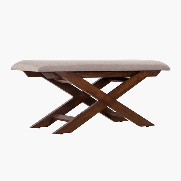 Banca Argentina, fabricada a partir de madera de Pino Nacional entintada en Tabaco con Tapiz Linato color Avellana. Se recomienda acompañar junto con la mesa Bogota Rectangular.