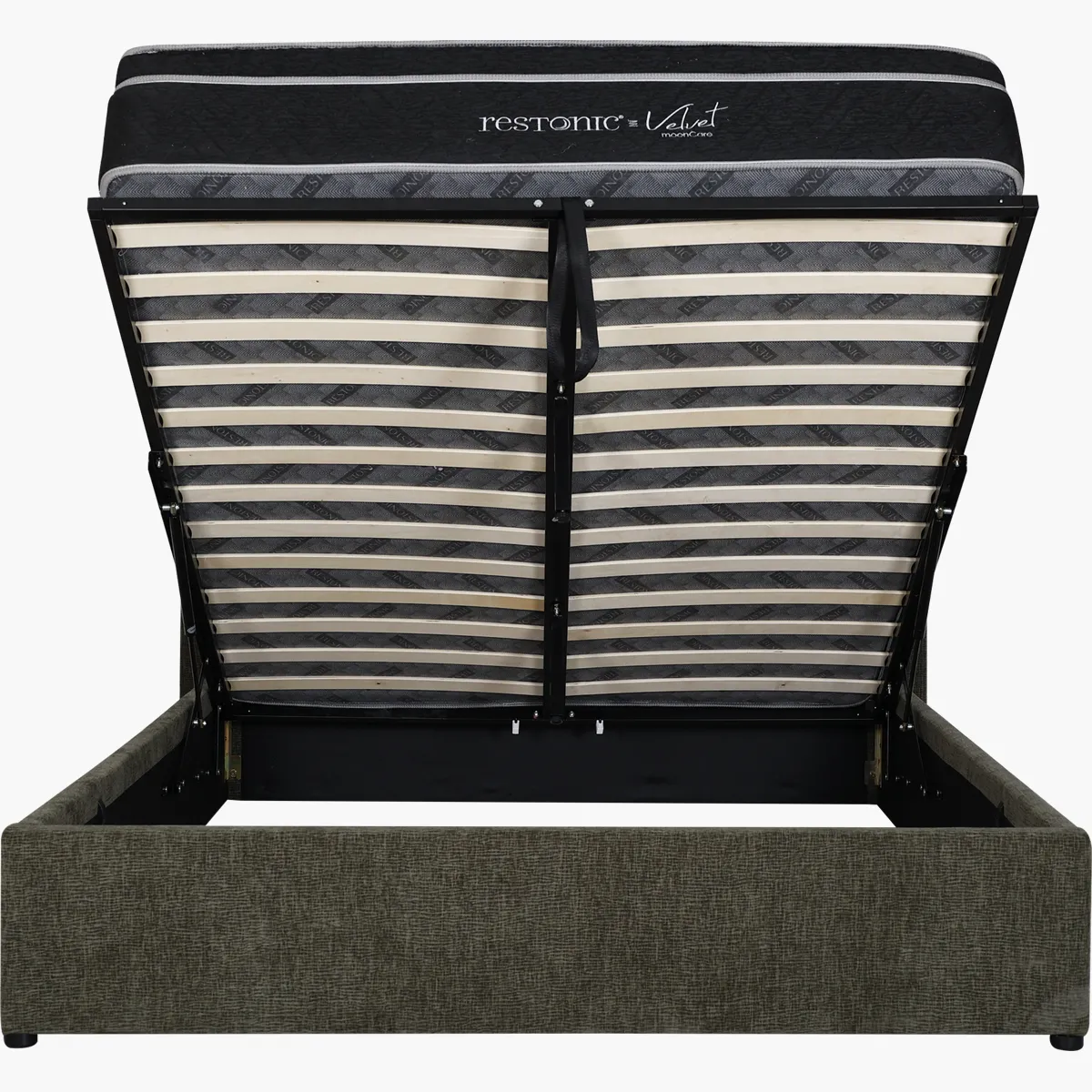 Su base cuenta con baúl de almacenamiento, perfecto para guardar cobijas, sábanas o artículos de temporada. La estructura se levanta fácilmente gracias a sus pistones, haciendo práctico y seguro el acceso al interior. Además, incluye cubrimiento interno en color negro para que lo almacenado no haga contacto con el piso, manteniendo tus pertenencias más limpias y protegidas.