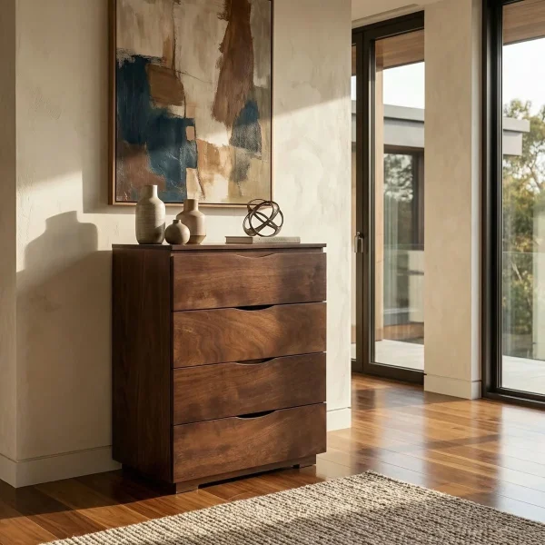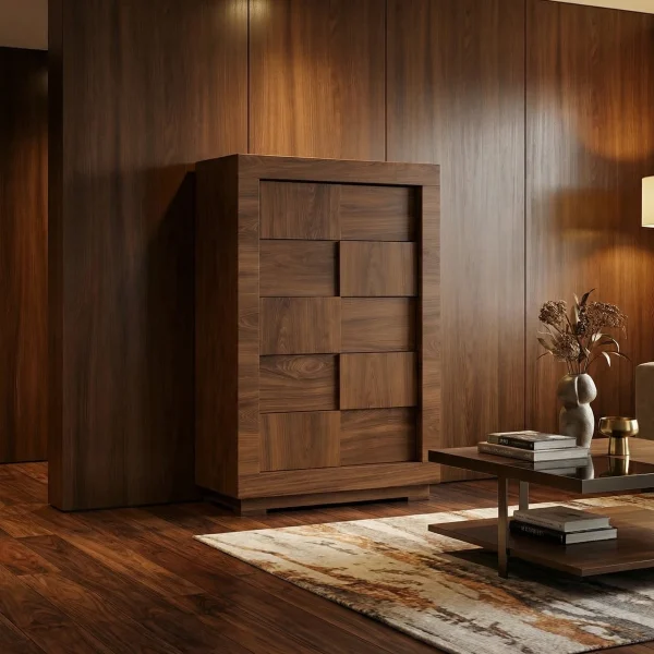 La línea Chifonier Noruega está construido con MDF Laqueado en color negro mate con detalles en los cajones de madera de Parota Natural. Materiales resistentes y ligeros, fácil de reacomodar en cualquier parte de la recamara por ser tan compacto. Cuenta con correderas de seguridad y patas de metal.
