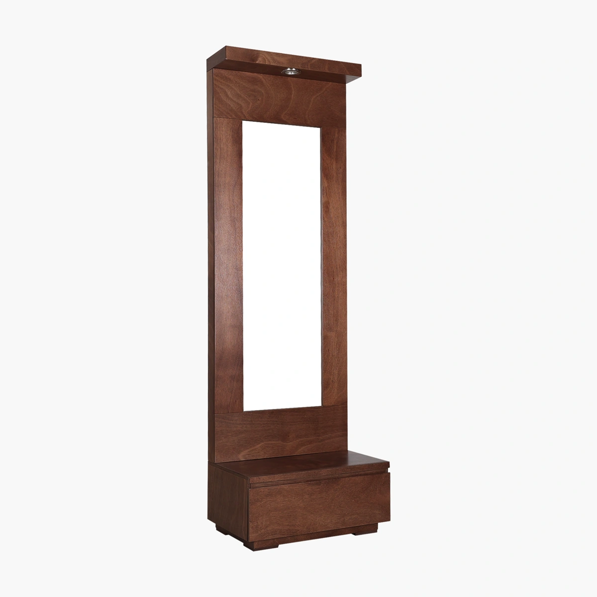Fabricado en chapa de okume, cuenta con una luz integrada en la parte superior que mejora la iluminación al momento de vestirte o arreglarte, además de un cajón inferior que brinda espacio adicional para guardar accesorios o artículos personales.