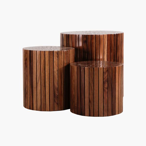 Compactas, con estilo y elegantes mesas de centro. Fabricadas en su totalidad por Parota Sólida. Perfectas para espacios reducidos, resaltando y acompañando la sala de su elección. Hermosas tiras de Parota Sólida que en conjunto forman el juego de 3 mesas centrales. Únicamente se venden las 3piezas en juego. Medidas: