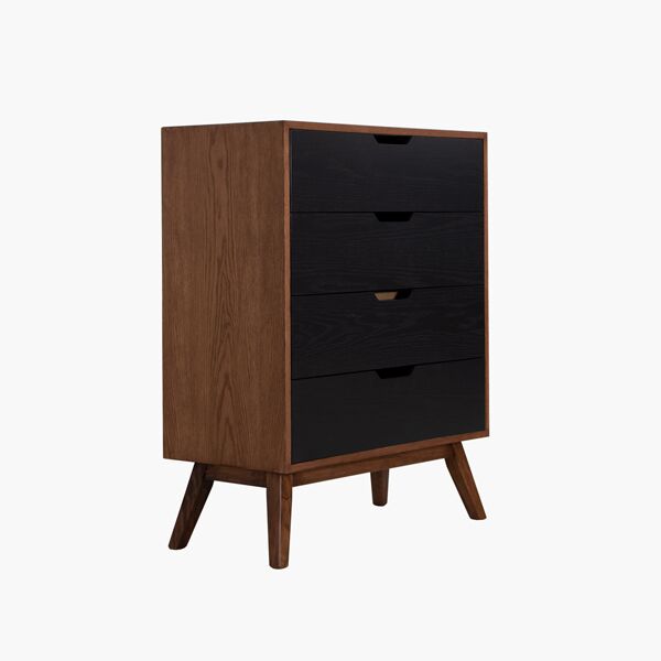 Cajonera con 4 cajones, formato vertical. Tiene cajones Negros con cuerpo en color Tabaco. Es estilo chic, minimalista y fresco que es ideal para complementar cualquier recamara juvenil o de estilo minimalista. Tiene soportes en madera color Tabaco y sus agarraderas están reflejadas en el diseño del corte de los cajones. ¡Mantén el orden en tu habitación con estilo! Medidas: 80cm x 40cm x 102cm. Materiales: Pino, Encino, Correderas de Extensión.