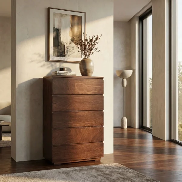 Cómoda Noruega Loft fabricada en MDF laqueado en color negro. Detalles en Parota sólida natural, con correderas de extension sin herrajes en sus cajones y base metálica. Complemento adaptable para una recamara juvenil o un comedor. Transforma tú espacio con un toque fresco e industrial.