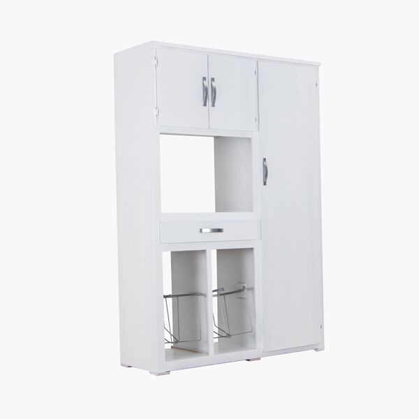 Compacta y sencilla Alacena Montreal fabricada en su totalidad por MDF pintado en Blanco. Es una excelente opción para almacenar de manera organizada y ordenada su vajilla y alimentos. Cuenta con una espacio para microondas, 2 Porta Garrafones, varios compartimentos y cajón con corredera de extensión.
