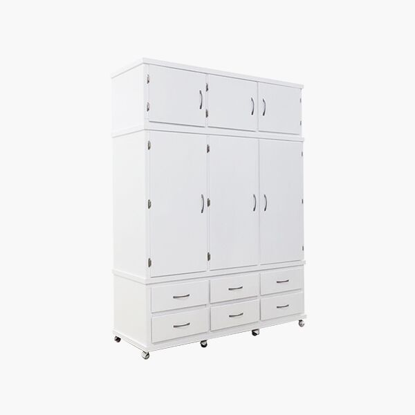 Amplio y elegante ropero Montecarlo fabricado en su totalidad por MDF pintado en Negro-Chocolate | Blanco. Es una excelente opción para almacenar de manera organizada y ordenada sus prendas de vestir. Cuenta con barras dentro de las puertas para colocar los ganchos de su preferencia. También cuenta con 6 cajones inferiores con correderas de extensión y 3 compartimientos superiores.