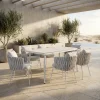 Las sillas Cozumel destacan por su estructura de acero pintado en blanco y están forradas con rattan sintético color mármol, diseñado especialmente para exteriores: resistente a la humedad, hongos y de secado rápido. Tanto el asiento como el respaldo son acolchonados y cuentan con cojines tapizados en tela outdoor tipo sunbrella de gran confort y durabilidad.
