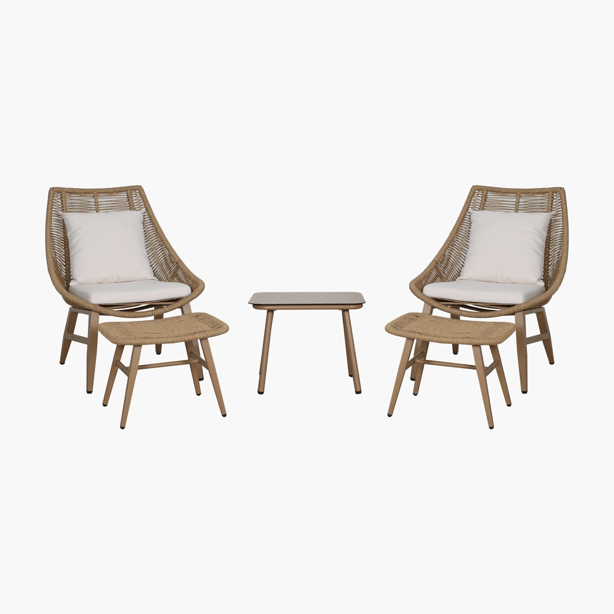 Elegante SET diseñado para soportar los exteriores. Estructura sólida de Acero con electroestática la cual no permite corrosión y cubierto de una hermosa y resistente cuerda a prueba de exteriores color arena. Además de contar con un cómodo y acolchonado tanto su asiento como su respaldo a prueba de intemperie. Cubierta de mesa central fabricada en su totalidad por Vidrio Templado con un hermoso diseño de imitación madera.Déjate encantar por su comodidad y belleza. SET compuesto por 5 piezas: 2 Sillones + 2 Reposapiés + 1 Mesa de centro Medidas: